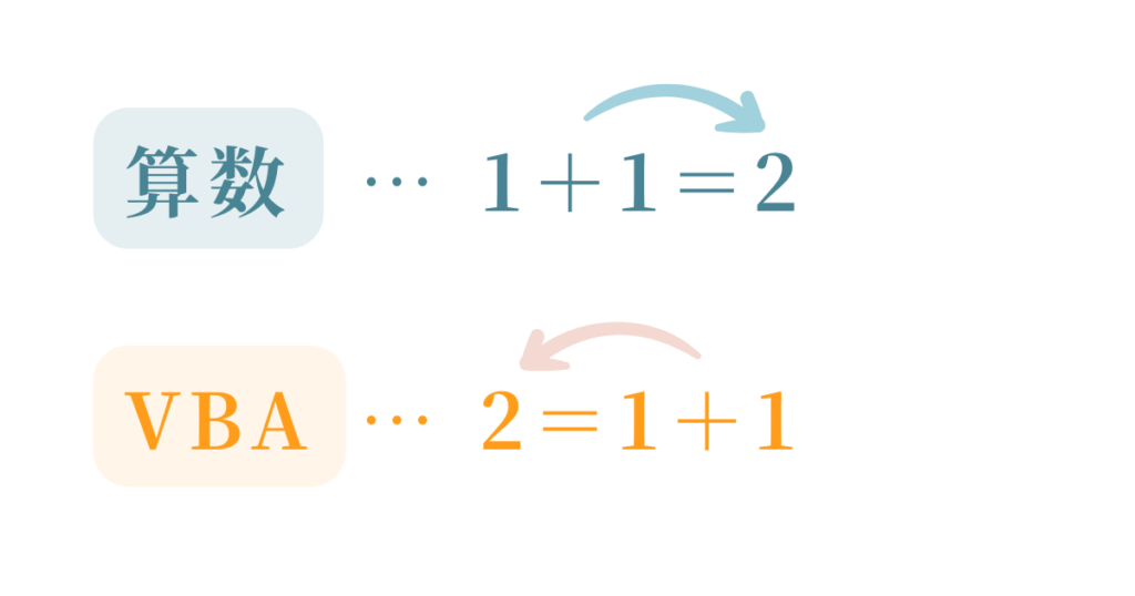 VBAでは反対で、イコールの右側で計算されたものが、イコールの左側に入力されます。