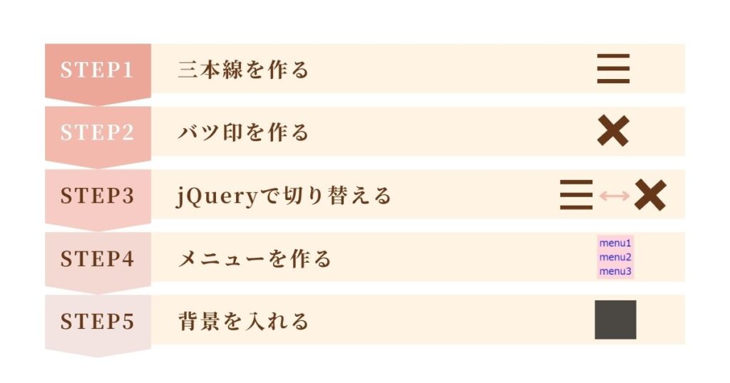 ハンバーガーメニューの作成を5STEPにわけて、一つずつ解説します。